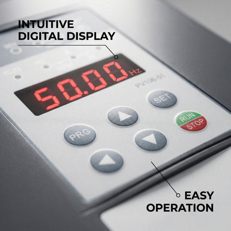 The PV100 Inverter combines simplicity with robust performance. Designed for easy installation and user-friendly wiring, it features up to IP65 protection for reliable outdoor use. With a built-in AC/DC switch, it offers flexible power input and can even operate as a standard VFD when solar function is disabled. Its advanced MPPT algorithm ensures efficient power harvest and rapid response to fading sunlight, while comprehensive pump protections provide enhanced safety and durability.